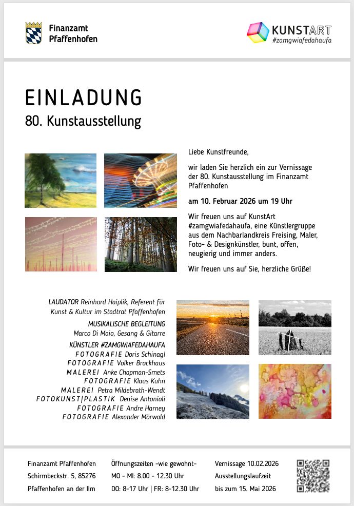 KulturLandkreisMarkt NandlstadtVeranstaltungen +++Der Freising.News Kunst-Tipp: Die Künstlergruppe aus Nandlstadt und Umgebung KUNSTART “zamgwiafedahaufa lädt alle Kunstfreunde zur Vernissage am 10. Februar um 19 Uhr ins Finanzamt Pfaffenhofen ein. Auch euer Fotograf Andre ist mit dabei.+++ 8. Februar 2026 AHA Ähnliche Beiträge