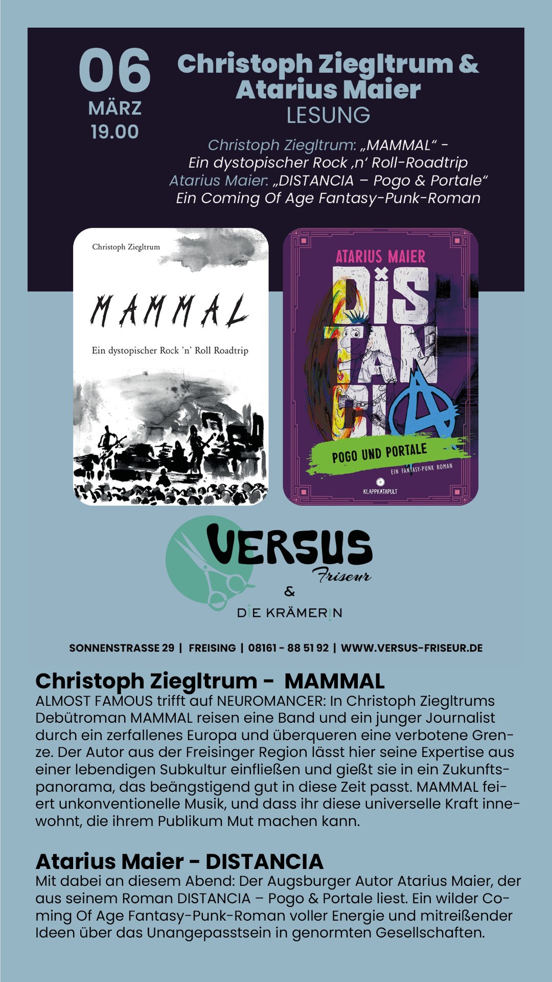 +++Der Freising.News Veranstaltungs Kultur-Tipp: Christoph Ziegltrum liest aus MAMMAL und Atarius Maier liest aus DISTANCIA. Lesung findet am Freitag 06. März ab 19 Uhr statt.+++
