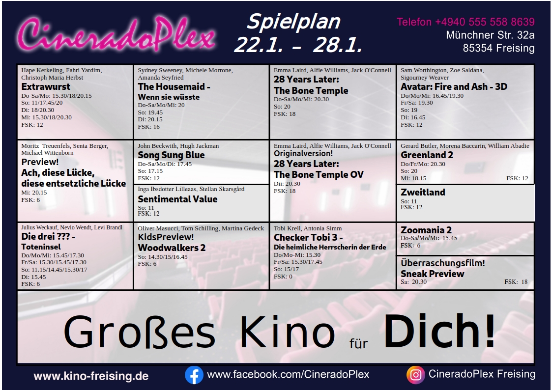 Veranstaltungen +++Freising.News Kino-Tipp: Das CineradoPlex Kino Freising Kinoprogramm vom DO 22.01.-Mi 28.01.2026.+++ 21. Januar 2026 AHA Ähnliche Beiträge