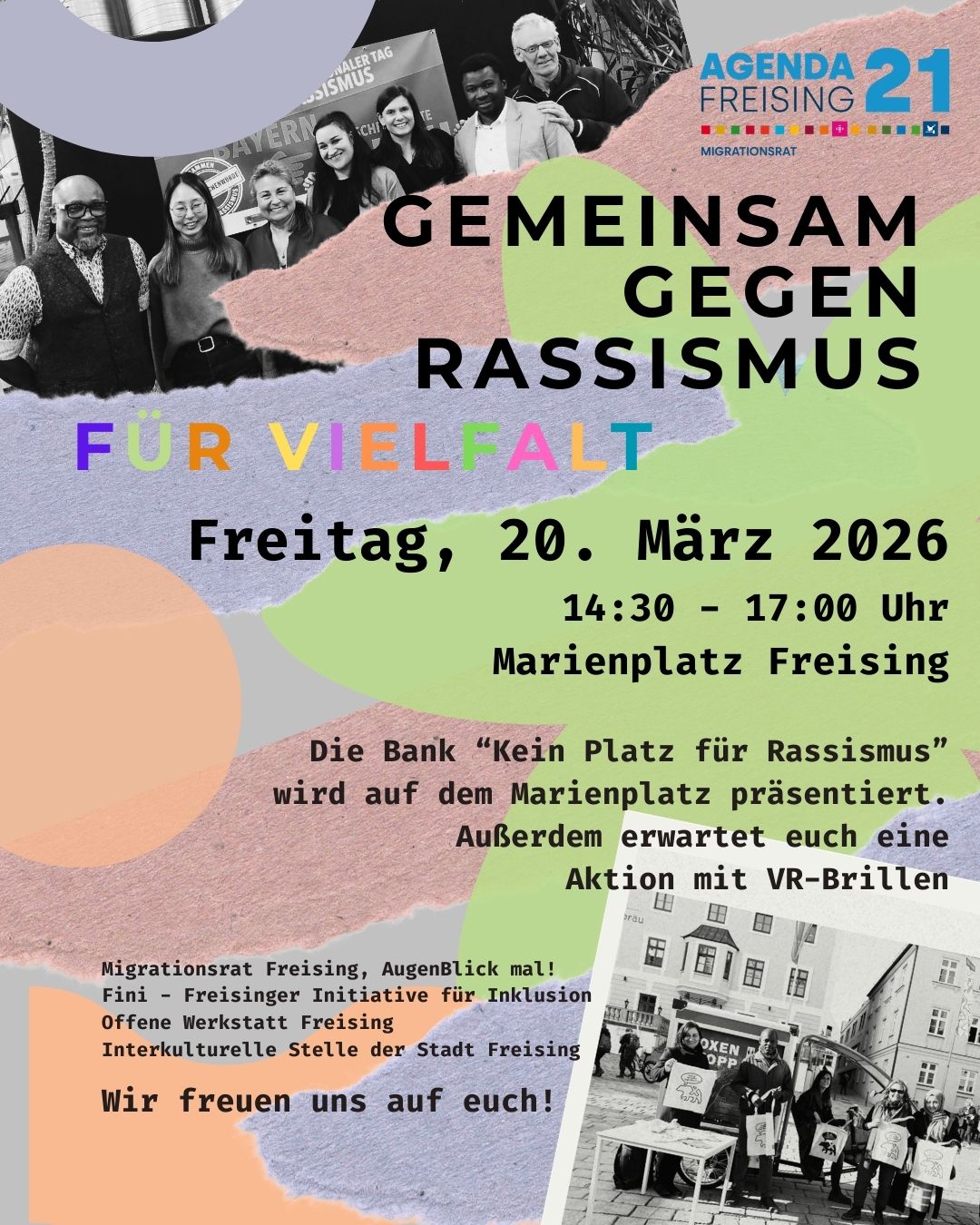 Am Freitag, den 20. März, von 14.30 bis 17.00 Uhr laden der Migrationsrat und die Interkulturelle Stelle der Stadt Freising zur Aktion „Gemeinsam gegen Rassismus – Für Vielfalt“ auf den Marienplatz ein. Mit der Aktion wird ein sichtbares Zeichen für Solidarität, Offenheit und gesellschaftlichen Zusammenhalt gesetzt. FINI, die Freisinger Initiative für Inklusion ist ebenfalls am Marienplatz vertreten, informiert und bietet eine Mitmach-Aktion für Kinder an.