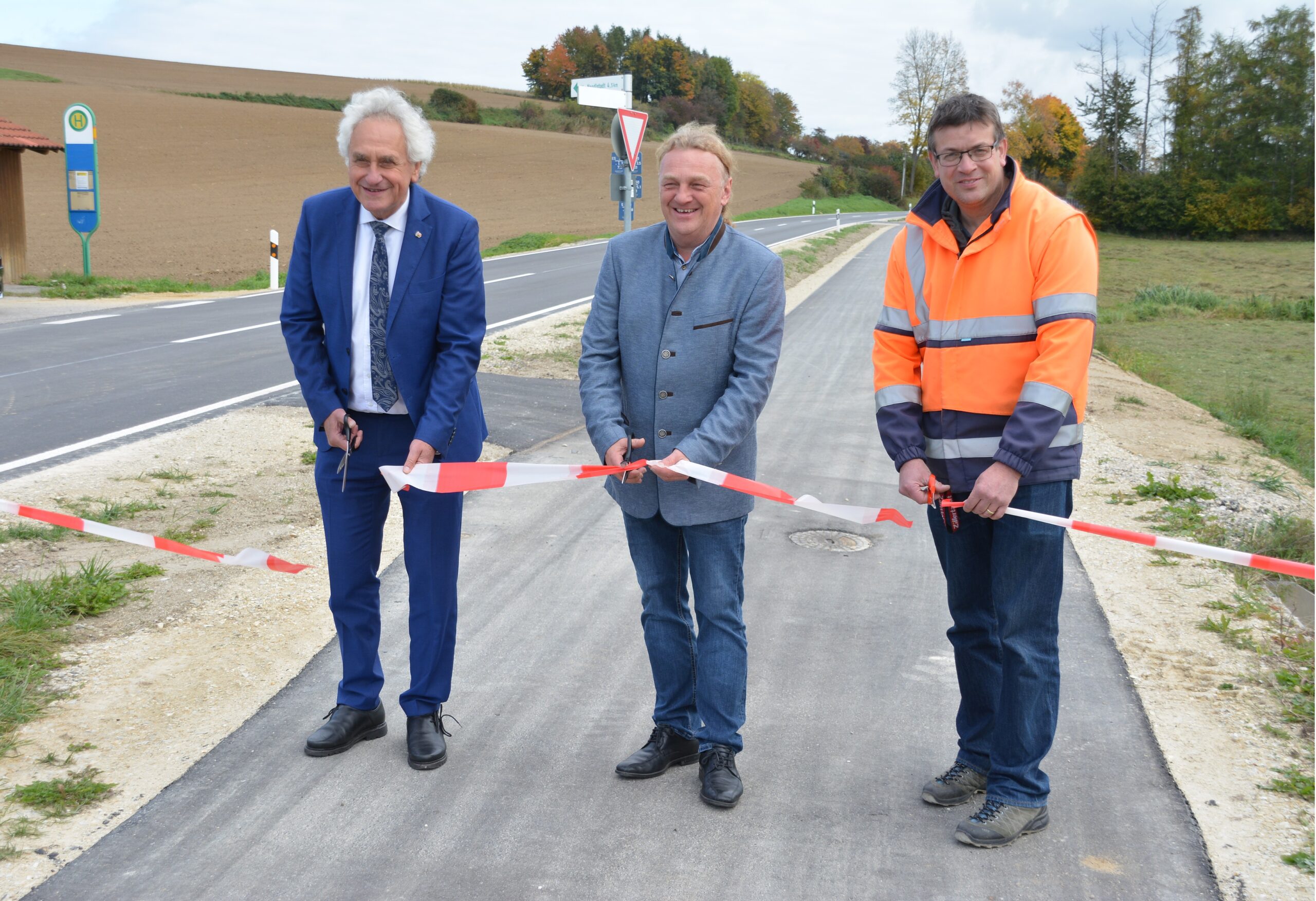 Sicher, komfortabel und umweltfreundlich unterwegs: Der neue Geh- und Radweg entlang der Kreisstraße FS 32 zwischen der Abzweigung nach Tölzkirchen undSchwaig ist offiziell eröffnet. Landrat Helmut Petz, Nandlstadts 1. Bürgermeister Gerhard Betz und Urs Phillip vom Tiefbauamt des Landkreises Freising gaben den Weg nun symbolisch frei.