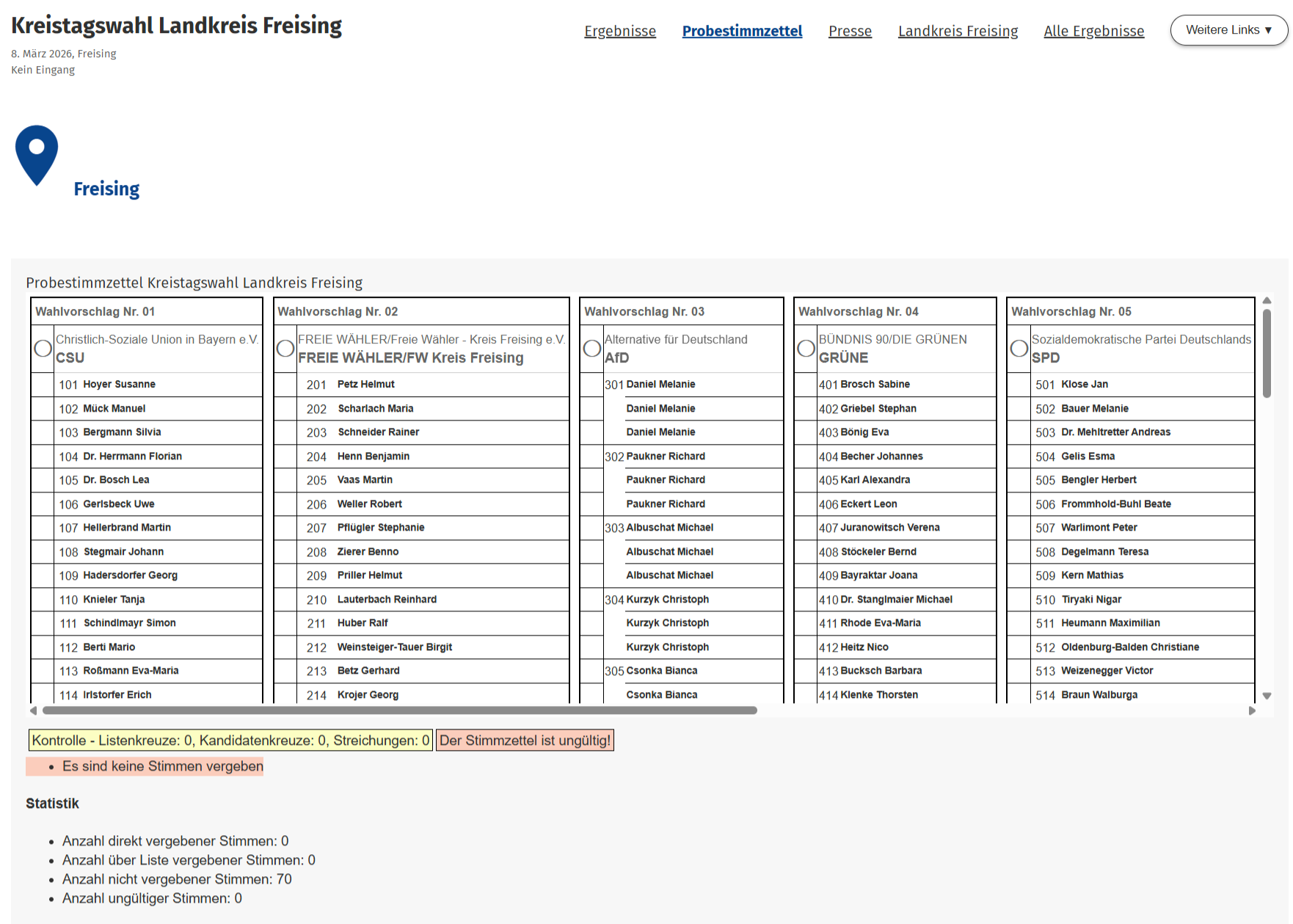 Der interaktive Probestimmzettel zur Kreistagswahl ist auf der Internetseite des Landratsamtes Freising abrufbar unter: https://kreistagswahl.kreis-freising.de/probestimmzettel.html.