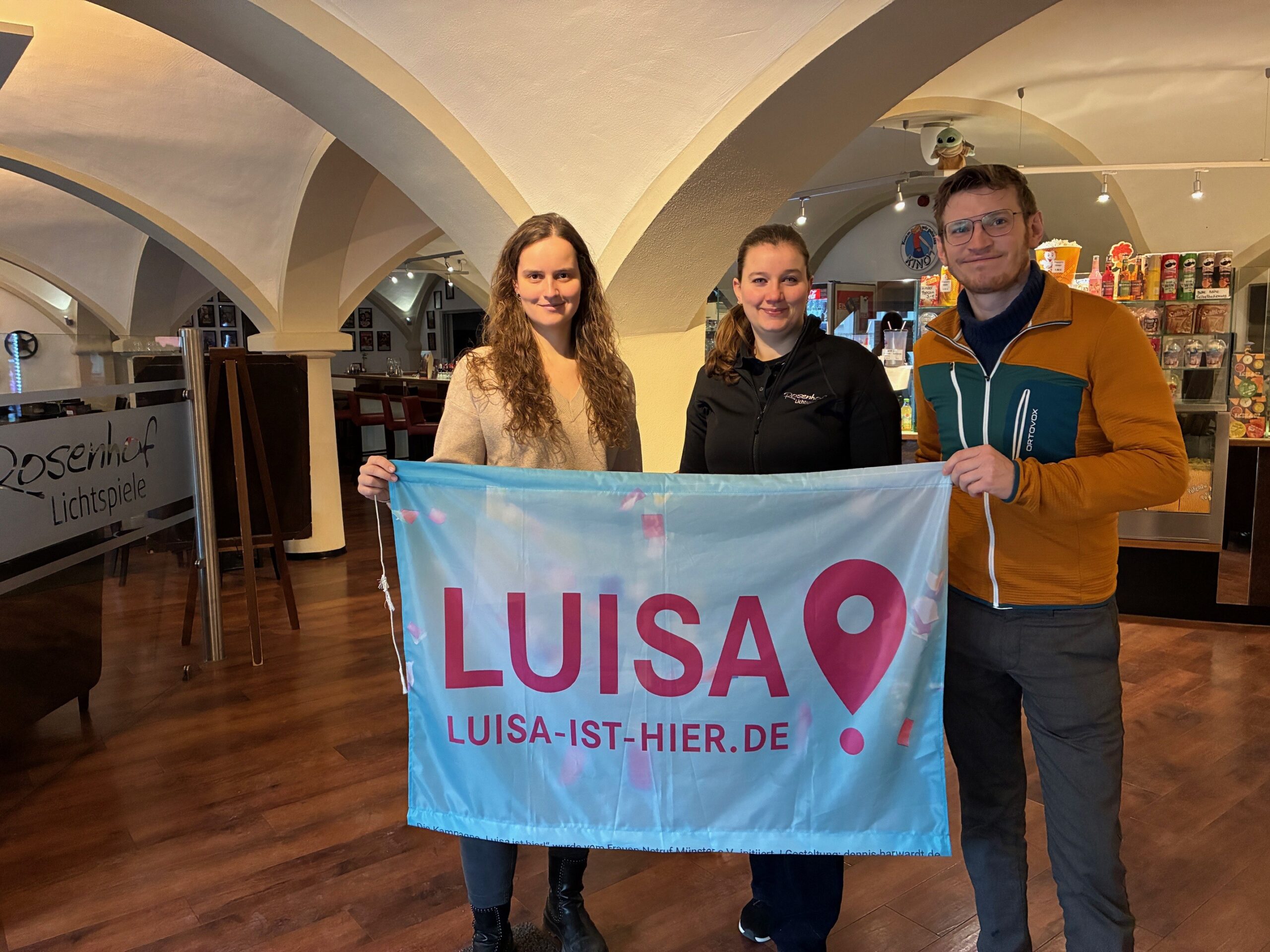 Zum Bild: Katharina von Schumann von der Kommunalen Jugendarbeit am Landratsamt Freising (v.l.) freut sich, dass die Rosenhof-Lichtspiele, hier mit Geschäftsführerin Verena Dollinger und dem technischen Betriebsleiter Kilian Stackelberg, die Kampagne „LUISA IST HIER!“ einführen.