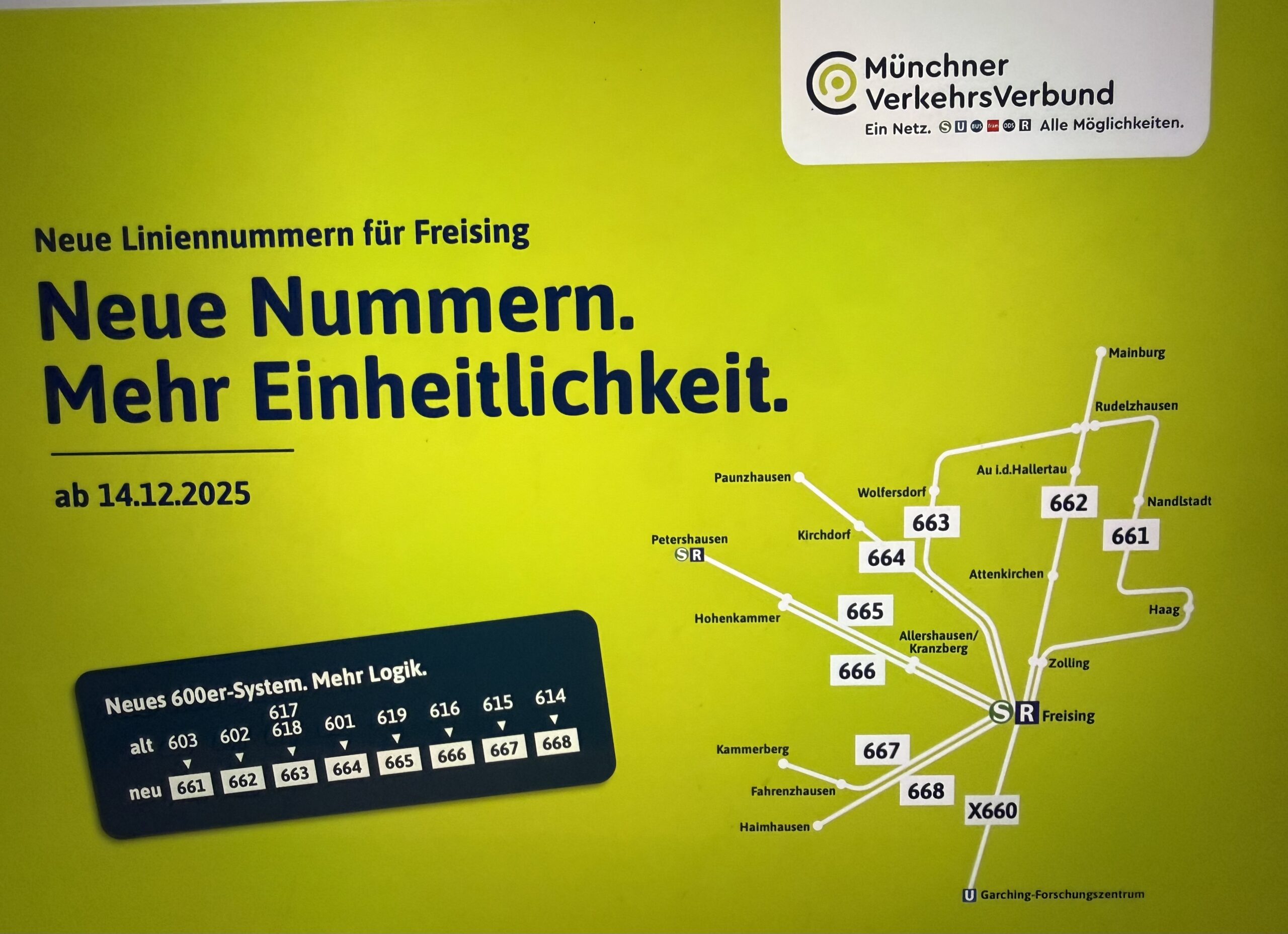 Mit dem Beitritt der Nachbarn von Stadt und Landkreis Landshut sowie der Landkreise Garmisch-Partenkirchen und Mühldorf am Inn steigt die Zahl der MVV-Verbundlandkreise und -städte ab dem 1. Januar 2026 von aktuell 13 auf künftig 17 an. Dies erfordert eine teilweise Neustrukturierung der bisherigen Liniennummerierung im MVV-Regionalbusverkehr. Stadt und Landkreis Freising haben die Nummernbereiche 600 bis 629 und 670 bis 679 abgegeben, damit Stadt und Landkreis Landshut sinnvoll in das System der MVV-Liniennummern integriert werden können. [Die Details sind der Grafik zu entnehmen]