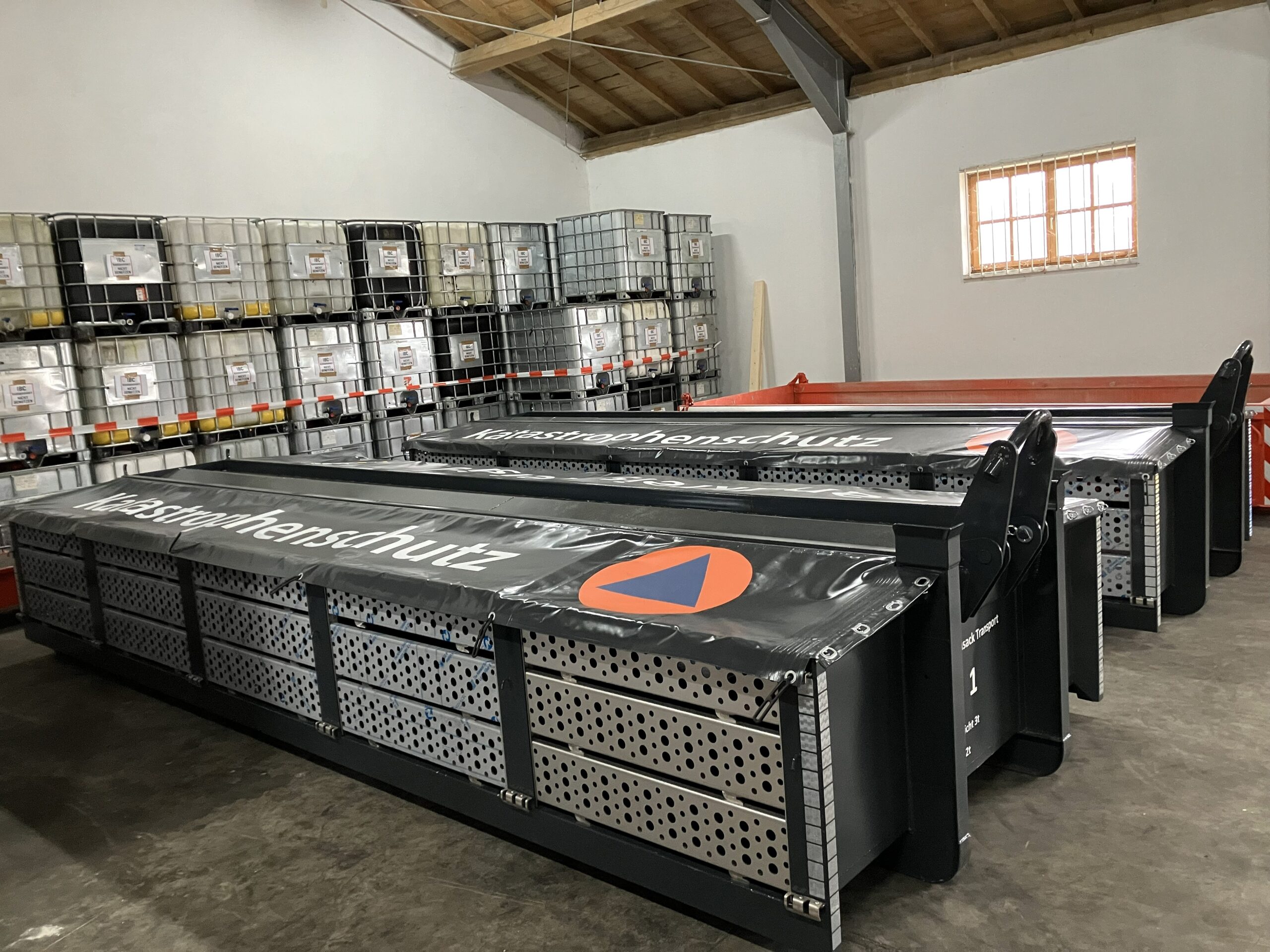 Auf den beiden neuen Abrollbehältern „Sandsack-Transport“ können insgesamt 1.400 Sandsäcke vorgefüllt, fachgerecht gestapelt und unmittelbar einsatzbereit eingelagert werden. Dadurch können die Behälter bei einem erneuten Hochwasserereignis sofort an die Einsatzstellen gebracht und ohne zeitaufwendige Befüll- oder Umladearbeiten genutzt werden. Jeder Abrollbehälter verfügt über fünf getrennte Kammern mit jeweils 140 Sandsäcken, die einzeln entleert werden können. Sowohl Teilentnahmen als auch eine kontrollierte seitliche Ausgabe der Sandsäcke sind möglich und gewährleisten einen schnellen, geordneten und taktisch flexiblen Einsatz vor Ort.