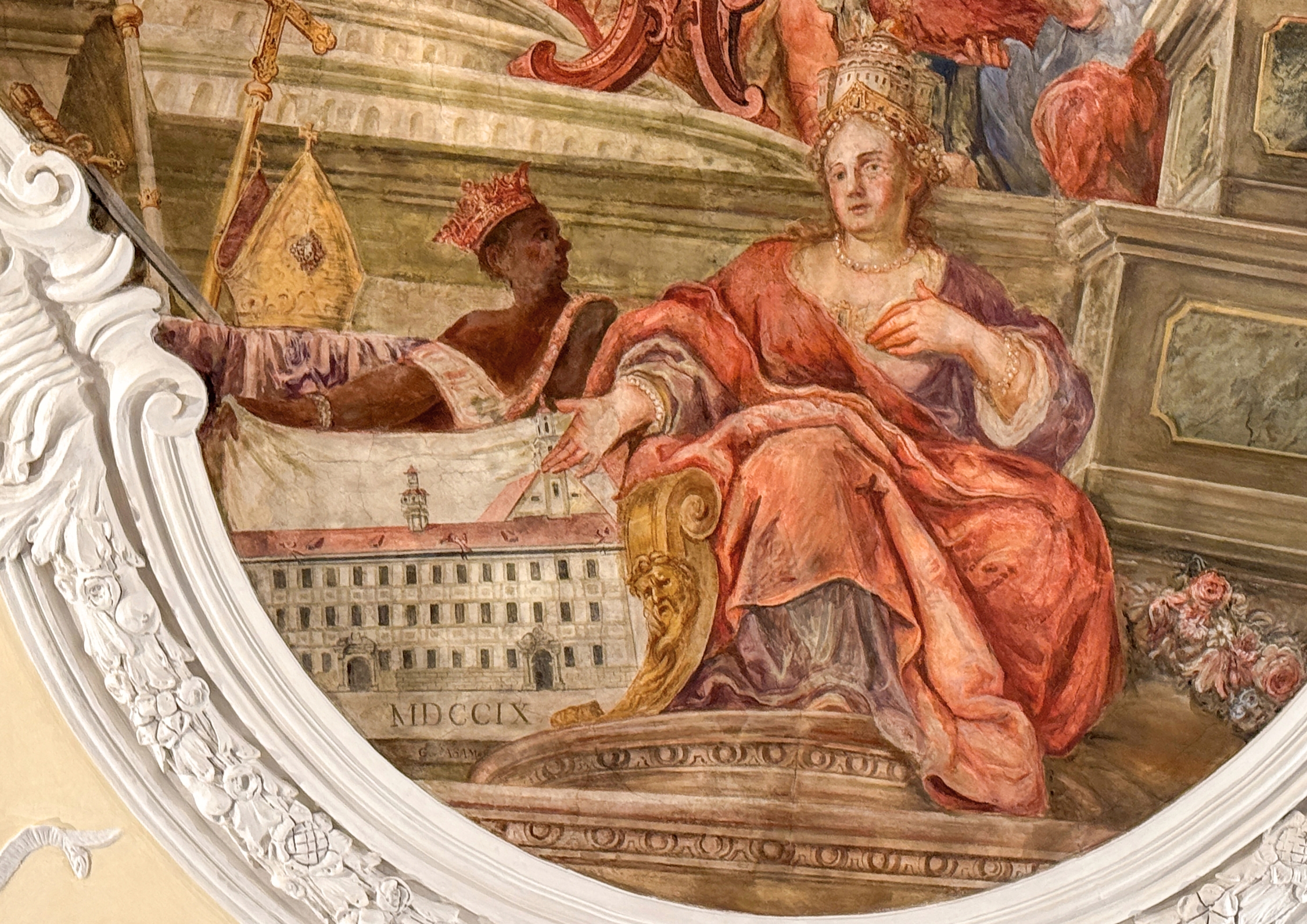 Bildunterschrift: Auf dem Fresko präsentiert „Frisinga” voller Stolz und Hingabe den Plan des neuen Asamgebäudes – genauso zeigen die Freisinger Stadtführerinnen und Stadtführer ihre Heimatstadt.
