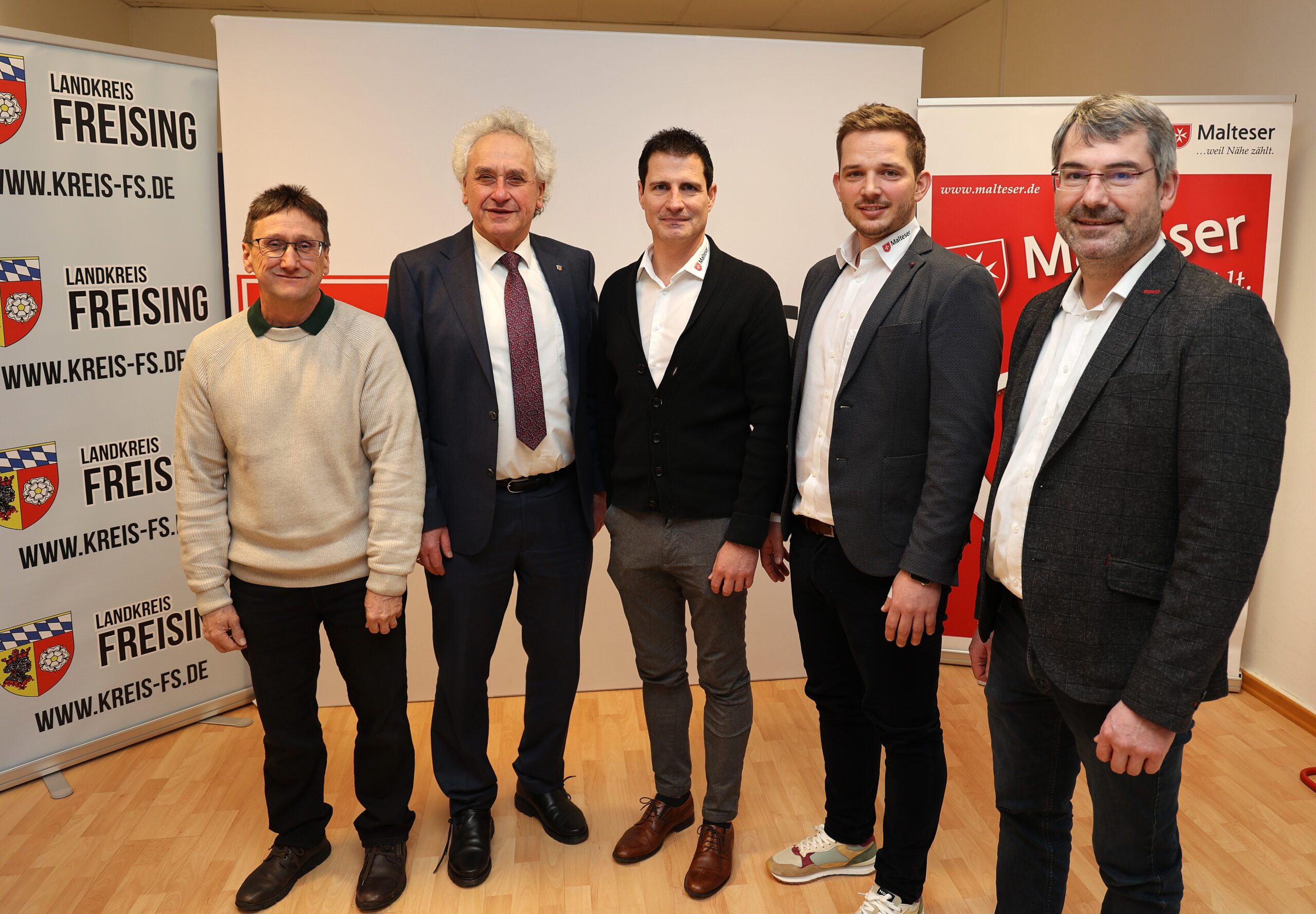 Übergangspflege und Versorgungsquartiere: Sozialamtsleiter Werner Wagensonner (v.li.), Landrat Helmut Petz, Stefan Lackner (Malteser, Leiter Soziale Dienste), Sebastian Oberpriller (Malteser, Kreisgeschäftsführer) und Herbert Eder (Malteser, Bezirksgeschäftsführer) informierten zu den Themen Übergangspflege und Versorgung vor Ort. Foto: Landratsamt Freising