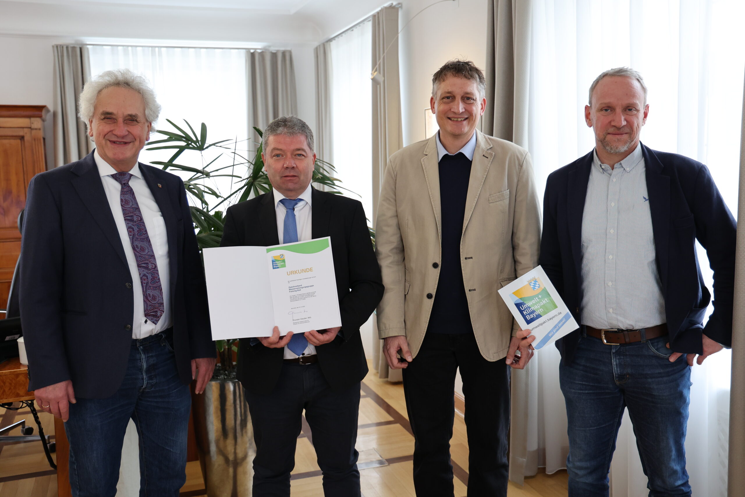 Landrat Helmut Petz (v.l.) überreichte die Urkunde zur Teilnahme am Umwelt- und Klimapakt Bayern an den stellvertretenden Verbandsvorsitzenden Peter Felbermeier sowie die Geschäftsleiter Markus Schmitz und Stephan Brenninger.