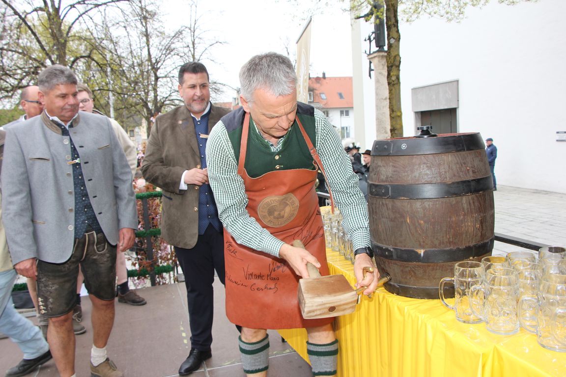 Der 1. Bürgermeister Franz Heilmeier zapfte das Bier an. Das Bier kommt von der Schlossbrauerei Au . Traditionelles Standkonzert mit Bieranstich vor dem Neufahrner Rathaus.
